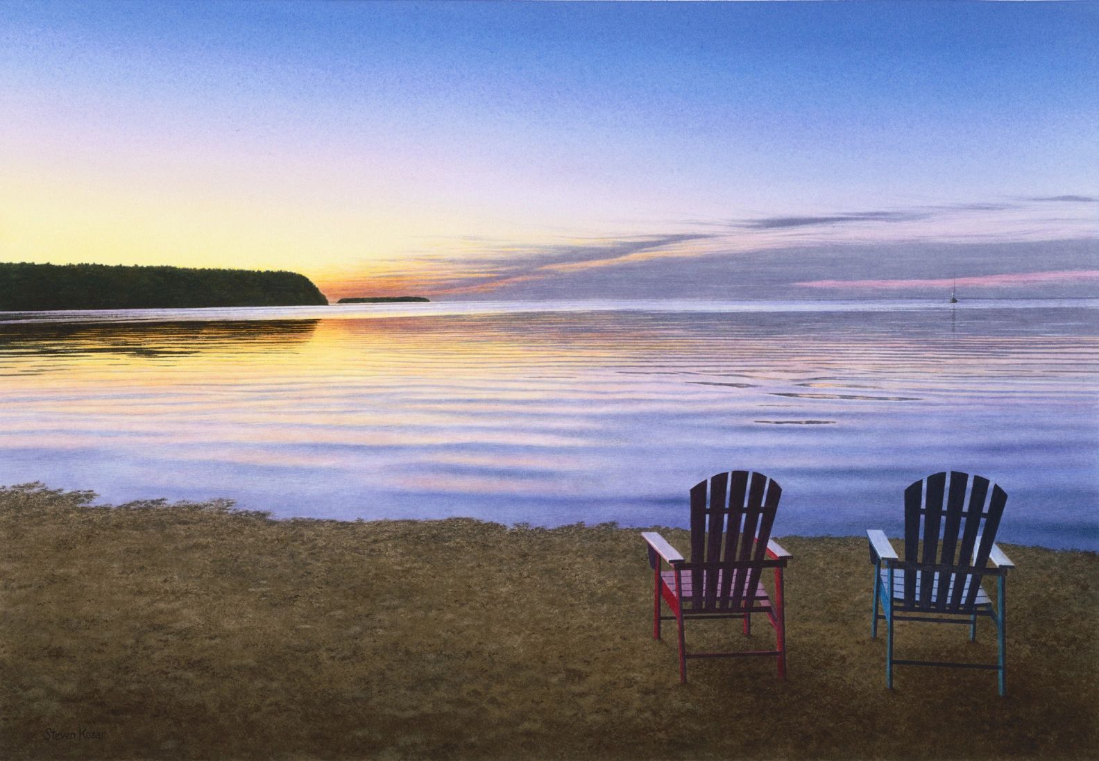 "After attending a Door County art fair I was out driving around looking for a new painting idea. Actually, I had a piece of cherry pie from the Sister Bay Cafe and then I went out driving around looking for a new painting idea. As soon as I saw these two chairs alone on the beach I turned around and quickly took a few photos before it was totally dark. About three months later the idea had become a watercolor painting-taking about twice as long as I thought it would. I won't tell you exactly which beach is was, since I was (very briefly) trespassing. Relax, and enjoy this Door County Sunset." -Steven Kozar