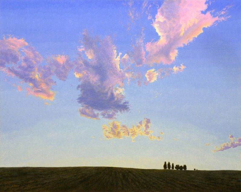 "This is an unusual painting compared to much of the work I normally do. I photographed this beautiful sunset in our neighborhood but I added the wide-open "Tuscany" type of landscape from my imagination. It was a really fun experiment and I think it comes across as a cohesive and appealing landscape painting." -Steven Kozar