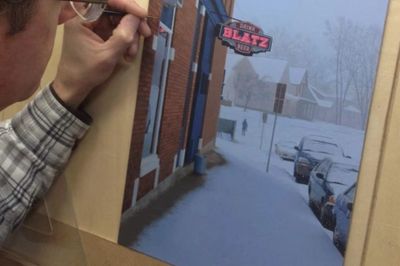 I ran around town like a mad man, trying to capture as much as I could before it got too dark. After shooting many great ideas and thinking I was done, I turned a corner to find this scene! This oil painting seemed to take forever, but in actuality, it was about four months of painstaking work. I think it was worth it!" -Steven Kozar